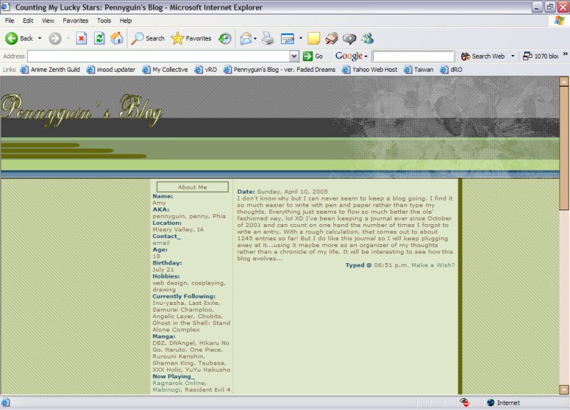 This happens to be the final layout of my blog. I'm no longer using it...Why not? Well, I found that I just kept forgetting to write in it. Pitas.com was the host, and don't get me wrong, I love the way they let you customize their online journals. So much better than anything else that's out there *cough cough*. My domain however was getting rather spread out on sites that weren't even located on animezenith.com ^^; I wanted to keep everything under one roof so that's why I moved it. Hopefully this will also remind me to write more entries, heh.